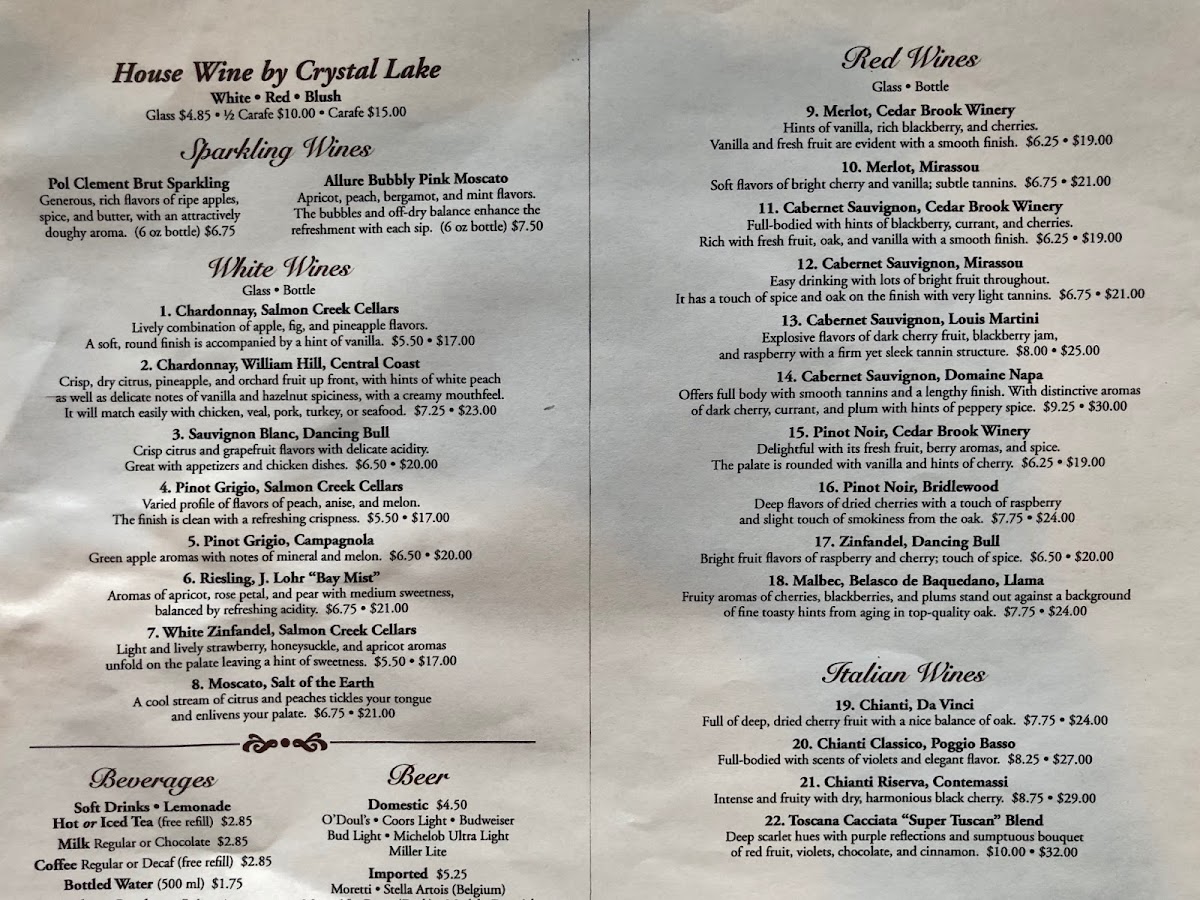 This pale,straw-yellow Italian wine is fresh and dry with a fruity and floral fragrance, and a fine perlage (6 0z). All wines are already 20% reduced price from regular menu.