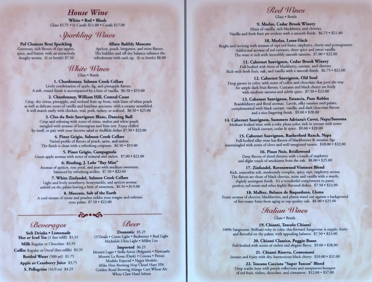 Hints of vanilla, rich blackberry, and cherries. Vanilla and fresh fruit are evident with a smooth finish. All wines are already 20% reduced price from regular menu.